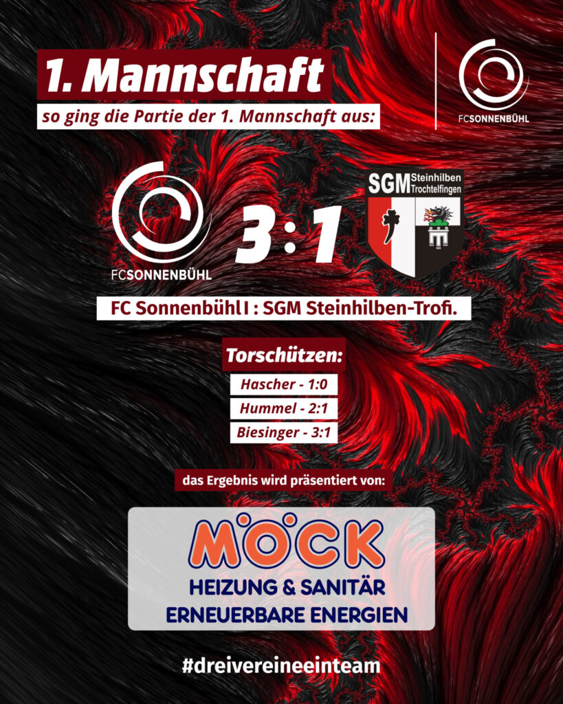 FC Sonnenbühl I – Kreisliga A / 1. Mannschaft / Von Jan Maier Zweiter Sieg im zweiten SpielMit dem zweiten Sieg im zweiten Spiel bleiben weitere Punkte in Sonnenbühl. Neuzugang Hascher, Silvan Hummel und Nick Biesinger erzielten die Tore für den FC.