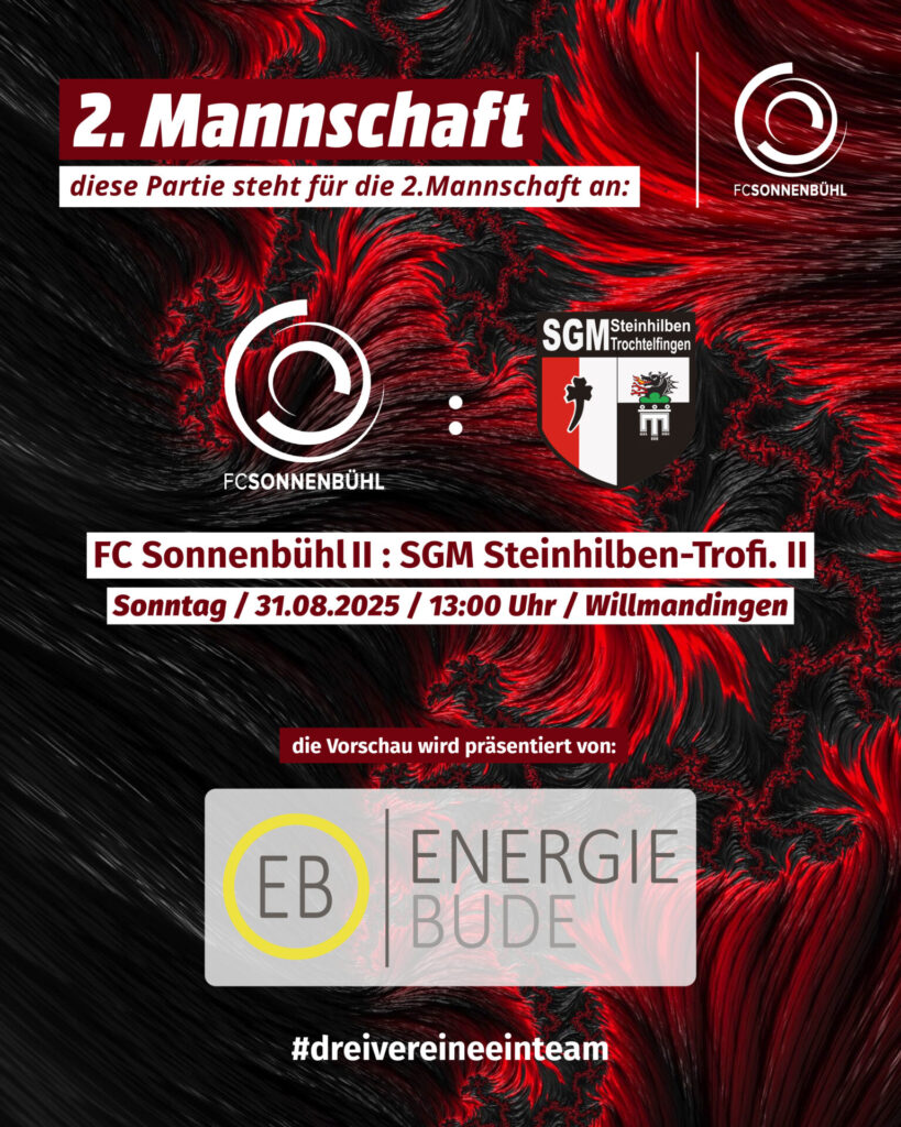 FC Sonnenbühl II – Kreisliga B / 2. Mannschaft / Von Jan Maier SGM Steinhilben-Trochtelfingen zu GastZum Rundenstart darf die zweite Mannschaft gegen die Reserve der SGM Steinhilben-Trochtelfingen ran. Start des Spiels ist um 13:00 Uhr in Willmandingen